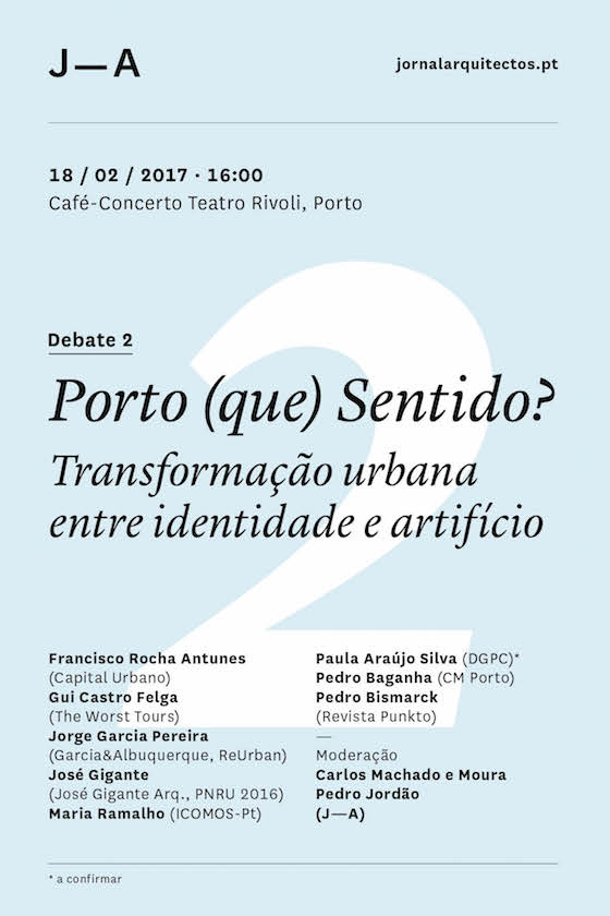No próximo dia 18/02/2017, terá lugar no Café-Concerto Teatro Rivoli, Porto, um Debate com o título "Porto (que) Sentido? Transformação urbana entre realidade e artifício".